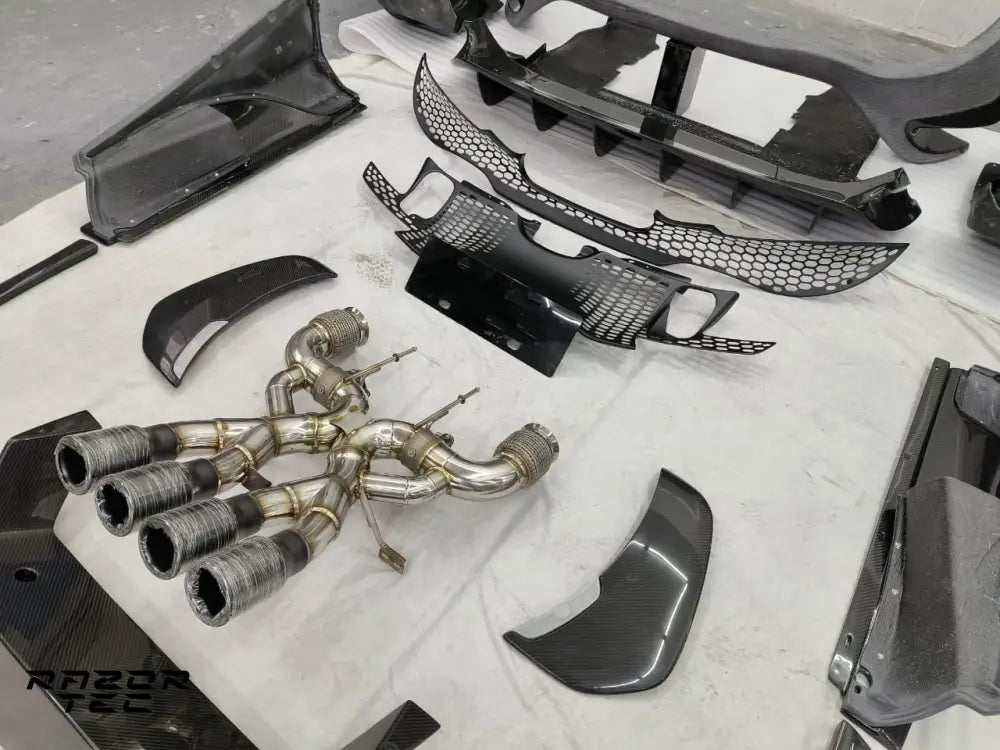 MCLAREN 720S Carbon Front Bumper + Front Lip Set MCLAREN 720S Carbon Rear Bumper + Rear Diffuser Set MCLAREN 720S Carbon Side Skirts MCLAREN 720S Carbon Fenders MCLAREN 720S Carbon Rear Engine Lid with mesh cover MCLAREN 720S Carbon Rear Wing spoiler MCLAREN 720S Carbon Exhaust with Quad center outlets (stainless steel with matt black or blue torched exhaust tips or titanium version)